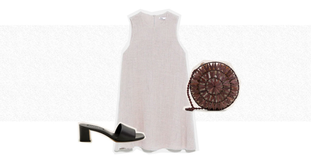 Идеальный вариант на лето для обладательниц маленькой груди – льняное платье-мини без рукавов с круглым вырезом и расклешенным низом. Такое платье умело уравновесит пропорции, а также подаст вашу фигуру в выгодном свете. Дополните его кожаными мюлями на каблуке и популярной в этом сезоне круглой деревянной сумкой. Подобный наряд будет особо уместен на отдыхе у морского побережья или в городе.
