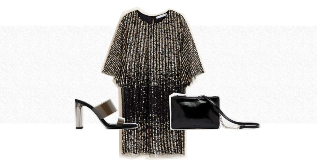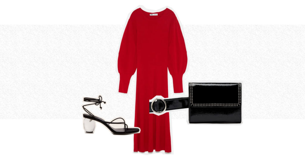 Скорректировать пропорции фигуры, зрительно сузив бедра и расширив плечи поможет трикотажное платье А-силуэта с объемными рукавами. Для обладательниц фигуры «груша» — это беспроигрышное решение. Дополните свой наряд стильными босоножками с завязками на прозрачном каблуке, а также подчеркните талию с помощью черной поясной сумки.