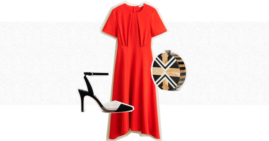 Первый наш образ для обладательниц узких бедер будет уместен на любом торжестве или культурном мероприятии. Красное платье-миди с асимметричной струящейся юбкой А-силуэта и присобранными деталями мгновенно добавит объем нижней части тела и поможет акцентировать талию. В качестве обуви отлично подойдут туфли-лодочки на высоком каблуке, а завершающей деталью станет деревянная сумка круглой формы с графическим узором.