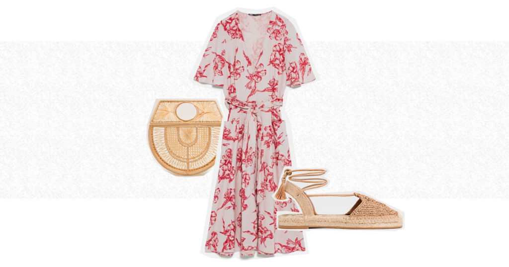Прекрасным решением летнего наряда для девушек с узкими бедрами станет романтичное платье-миди со струящейся трапециевидной юбкой и флористическим принтом. Завершите образ трендовыми атрибутами грядущего лета – плетеными эспадрильями и круглой сумкой ручной работы из рафии.