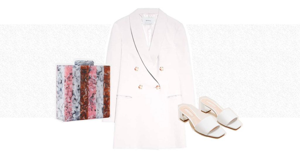 Для официальных мероприятий и светских выходов отдайте предпочтение модному в этому сезоне платью в виде удлиненного блейзера. Белый цвет, плотная ткань и правильный крой помогут сбалансировать фигуру и добавить объем в нижнюю часть тела. Стильным дополнением к образу послужат кожаные мюли на каблуке и не банальная трехцветная сумочка с отделкой под мрамор.