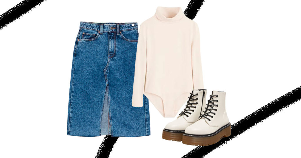 Следующий образ идеально подойдет для весенней прогулки по городу или похода в кафе с лучшими друзьями. Белое боди с высоким воротником в сочетании с джинсовой юбкой миди со стильным вырезом и белыми массивными ботинками на высокой платформе, образует беспроигрышный наряд, соответствующий главным трендам сезона. Ничего лишнего, но как стильно!