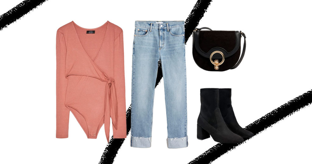 Начнем с того, что боди, выполненное из плотного трикотажа, вполне может заменить вам водолазку или свитер. Для первого образа мы подобрали пудровое боди в рубчик, отличающееся необычным кроем. Сочетаем его со свободными голубыми джинсами с высокой посадкой и получаем стильный образ на каждый день. Чтобы визуально вытянуть силуэт надеваем ботильоны на устойчивом каблуке и завешаем наряд ультра-модной сумкой в тон обуви.