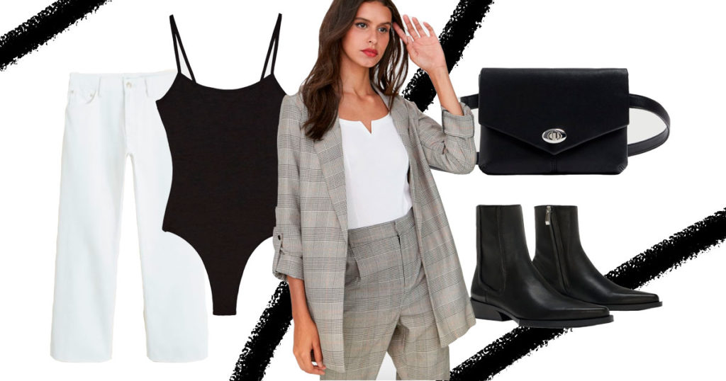 Oversize-блейзеры прочно укрепились в числе модных тенденций и пока не думают сдавать свои позиции. Более того, с их помощью повседневный наряд тут же становится более официальным и презентабельным, что делает его подходящим даже для деловой встречи или работы в офисе. Данный образ – пример того, как можно обыграть лук с обычным черным боди и белыми джинсами, добавив к нему несколько самых горячих хитов грядущей весны – клетчатый блейзер свободного кроя, ботильоны в ковбойском стиле и поясную сумку.