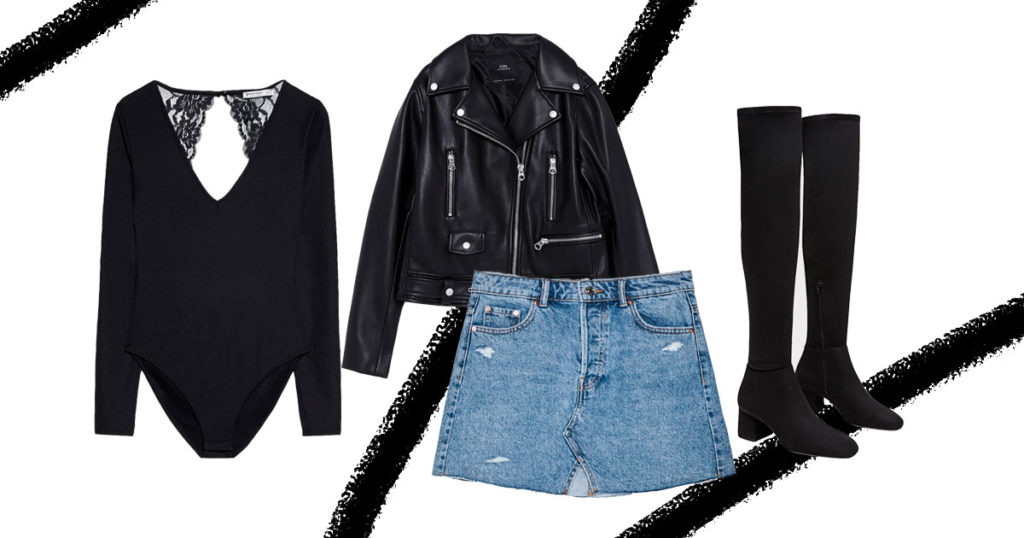 Скажите «да» черному монохромному образу! Делая акцент на сочетании различных материалов, таких как кожа, замша, деним, трикотаж и кружево, вы создаете продуманный и небанальный наряд, не требующий ярких деталей. Возьмите за основу черное боди с открытой спиной, длинным рукавом и кружевным декором, добавьте к нему джинсовую мини-юбки и высокие сапоги в тон. Придайте образу нотку гранжа и дерзости, надев черную куртку из искусственной кожи с ремнем, карманами и молниями.