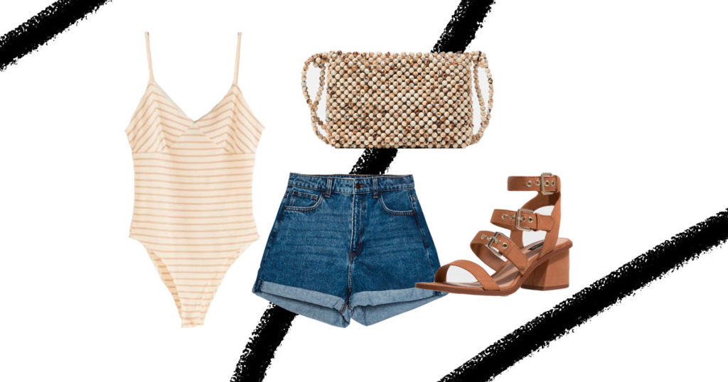 И напоследок – комфортный и довольно непринужденный образ, подходящий как для летней городской прогулки, так и для отдыха на природе или у морского побережья. Замените обычный топ фактурным пастельным боди в полоску на тонких бретелях и объедините его с джинсовыми шортами-mom с высокой посадкой. В качестве обуви отдайте предпочтение коричневым сандалиям с ремешками на устойчивом каблуке. В завершении добавьте к образу трендовый аксессуар, такой как бежевая сумка, выполненная из крупных декоративных бусин.