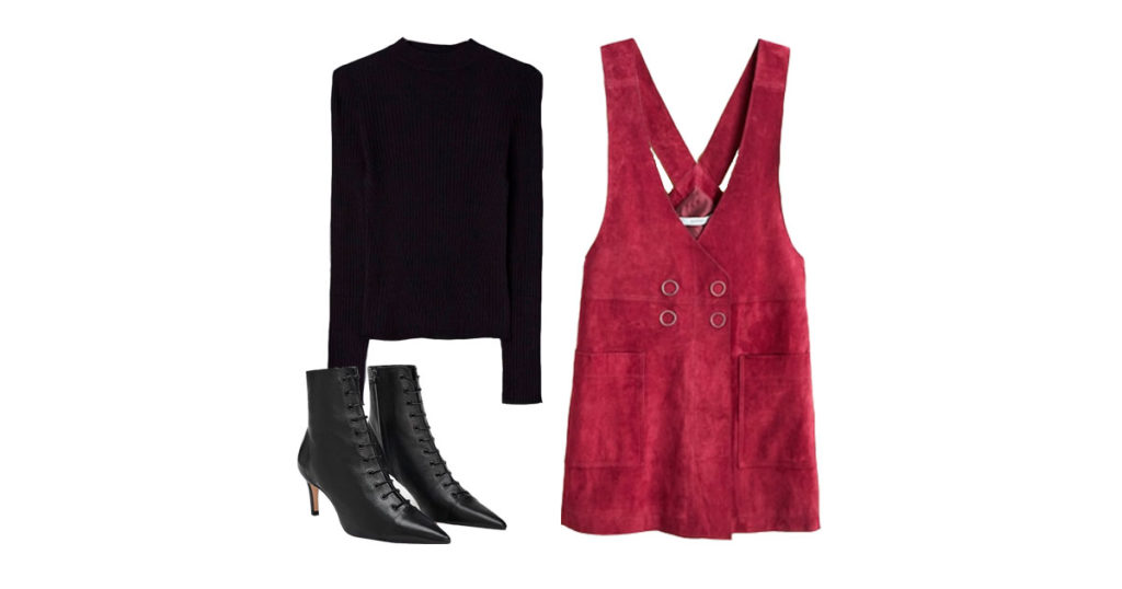 Главная фишка этого аутфита – короткий кожаный сарафан гранатового оттенка. Благодаря своей необычной фактуре, интересному фасону и насыщенному, глубокому цвету, этот сарафан способен стать идеальным решением для праздничных дней. Кроме того, вы с легкостью можете адаптировать его к любой погоде, подбирая актуальный «верх», в роли которого может выступать топ, свитер, боди, водолазка и т.д. В контексте данного образа мы объединили сарафан с черной водолазкой и остроносыми кожаными ботильонами в тон. Такой вариант прекрасно подчеркнет изящность вашей фигуры и осведомленность в последних трендах сезона. К тому же, вы наверняка захотите носить подобный наряд, не только 8 марта, но и на протяжении всей весны.