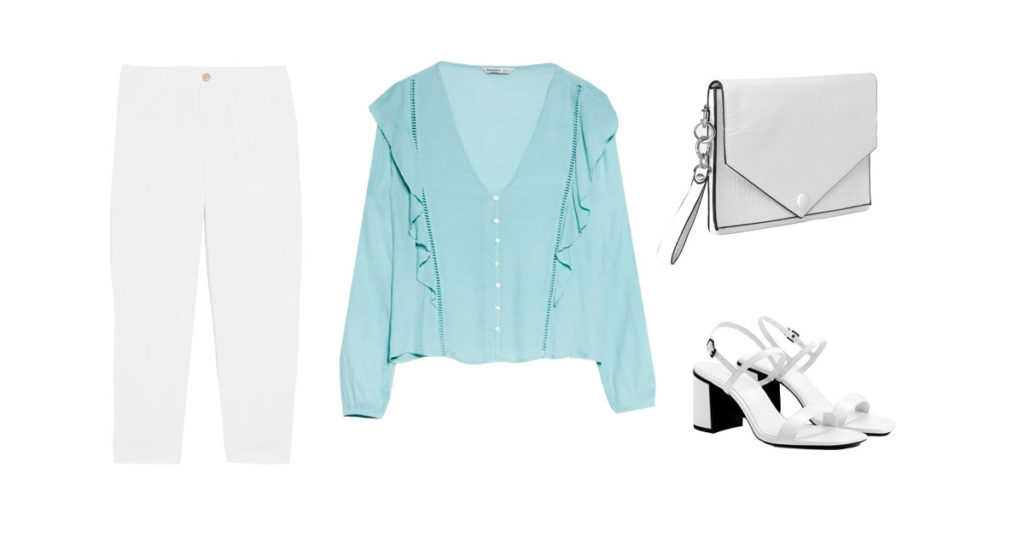 Если хочется отойти от традиционных платьев, попробуйте составить образ с нежной пастельно-бирюзовой блузой и белыми зауженными джинсами. Дополните наряд лаковыми белоснежными босоножками и клатчем-конвертом с эффектом змеиной кожи. За счет удачной комбинации светлых тонов и интересных текстур, образ получится ярким и запоминающимся. Кроме того, подобный наряд будет уместен, как в формате свидания в каком-нибудь богемном ресторане, так и светского мероприятия или вечеринки, где все взгляды будут прикованы к вам.