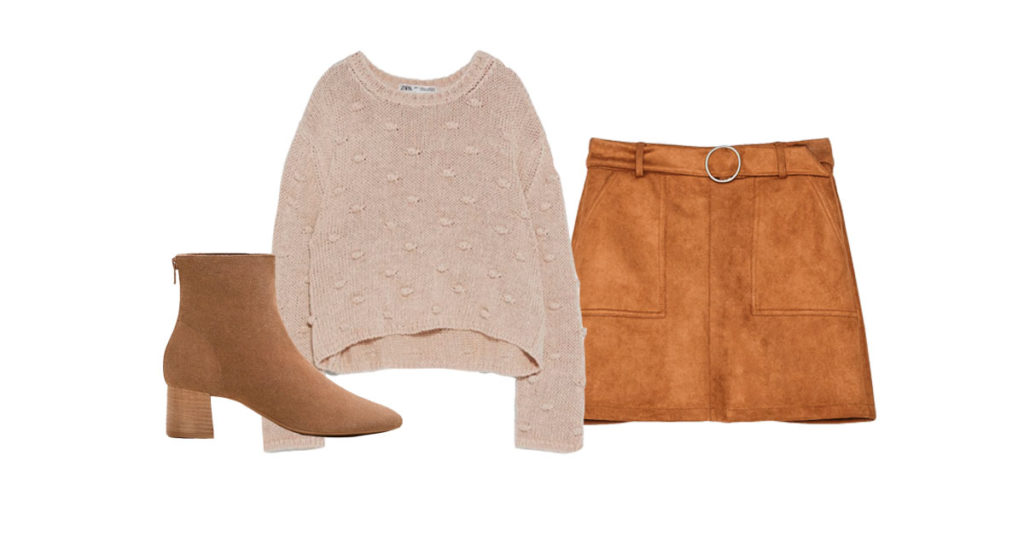 Этот образ – история о том, как выглядеть женственно и нарядно, ощущая себя при этом уютно и тепло. Учитывая, что в текущем сезоне особой популярностью пользуются плюшевые фактуры, за основу наряда мы взяли объемный и мягкий свитер с помпонами, способный подчеркнуть вашу хрупкость. Мини-юбка из искусственной замши ярко-коричневого цвета станет лучшей парой к свитеру и сумеет акцентировать достоинства фигуры. А кожаные полусапожки на устойчивом каблуке приглушенного песочного оттенка помогут завершить наряд с особым шиком.