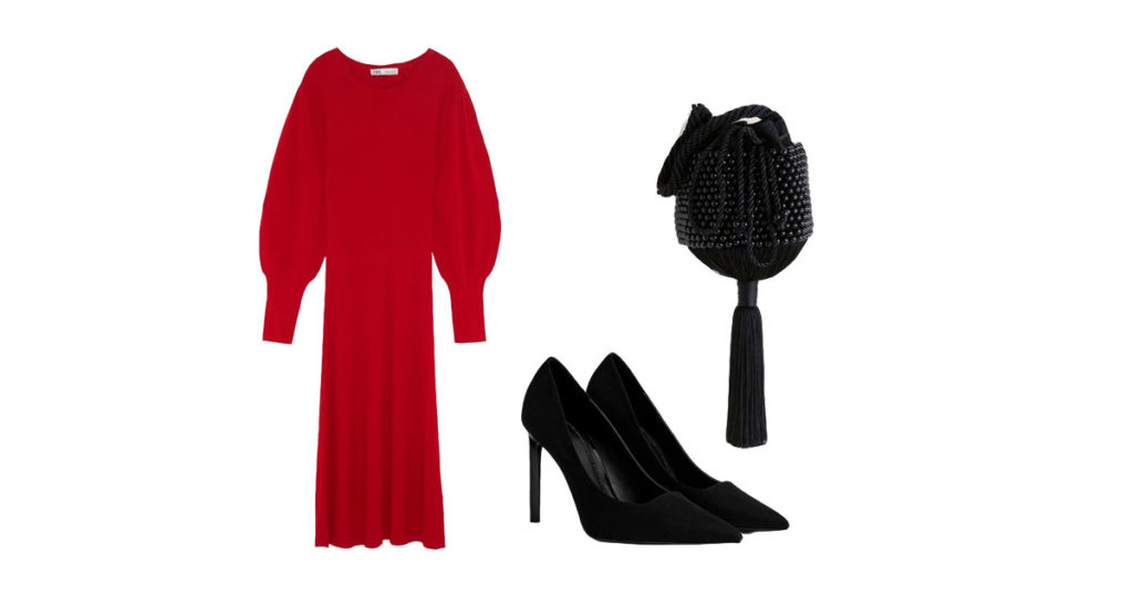 И напоследок – образ роковой красотки, сбивающей с ног всех проходящих мимо мужчин. Если в вас достаточно смелости и уверенности, то без лишней робости надевайте ярко-красное праздничное платье-миди с объемными рукавами. В качестве обуви отдайте предпочтение вневременной классике, дополнив платье черными туфлями-лодочками на шпильке с острым носком. И конечно, не забудьте о модной сумочке с интересным декором в виде бусин для дополнительного шика и роскоши. Как нам кажется, вы не прогадаете, если пойдете в таком образе в театр или на светский прием вместе со своим возлюбленным.