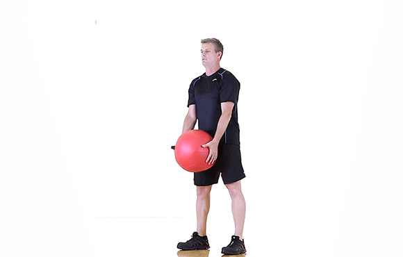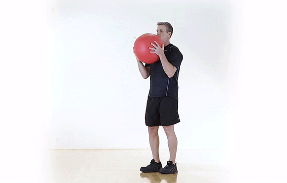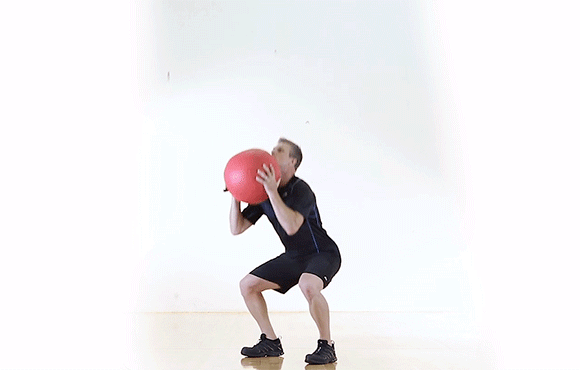 Встаньте так, чтобы ноги были немного шире ширины плеч, а носки слегка направлены в стороны. Держите мяч на уровне груди и сделайте приседание. Вернувшись в исходное положение, одновременно поднимите мяч вверх. Опустите мяч обратно вниз и начните делать следующее повторение.