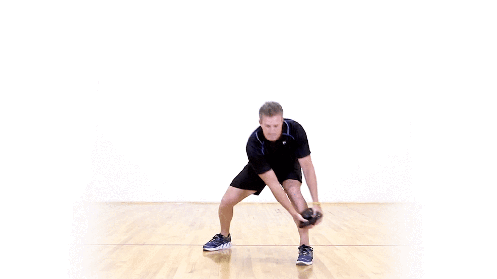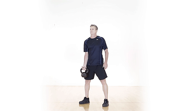 Встаньте, поставив ноги на ширине плеч и слегка вывернув наружу носки ног. Держите гирю обеими руками около лодыжки одной ноги (как на фото). Поднимите груз по диагонали вверх. Гиря будет над противоположным плечом. Медленно опустите её обратно в исходное положение и продолжайте делать упражнение. Выполняйте повторения на одной стороне в течение 20 секунд. Меняйте сторону для каждого 20-секундного интервала.