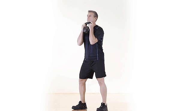 Встаньте, поставив ноги на ширине плеч и слегка вывернув наружу носки ног. Держите гирю двумя руками, согнув их в локтях. Вверх гири прижат к подбородку. Выполните стандартный присед, один повтор за другим. Сосредоточьтесь на поддержании спины прямой и не позволяйте коленям выдвигаться дальше носков ног на протяжении всего упражнения.