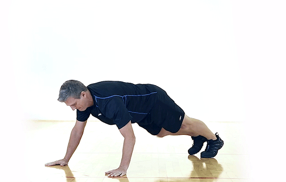 Примите упор лёжа. Руки согнуты в локтях. Ноги полностью прямые. Согните правую ногу в колене, выверните его наружу и подтяните как можно ближе к локтю правой руки. Сделайте то же с другим коленом и локтем. Сосредоточьтесь на поддержании спины прямой на протяжении всего движения и не позволяйте коленям опускаться на пол.