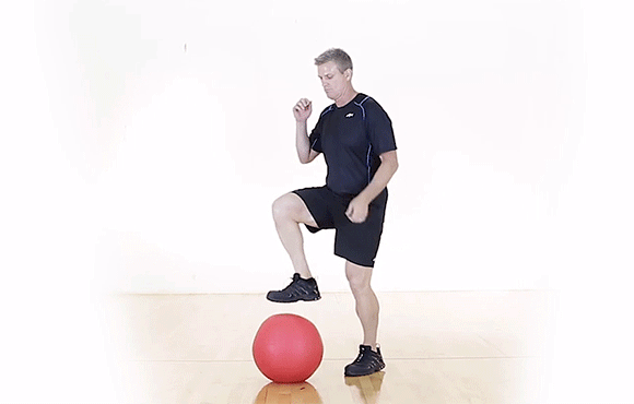 Поставьте мяч впереди своих ног. Поместите одну ступню на мяч, но не сильно прижимайте. Нога при этом будет согнута под углом 90 градусов. Вторая нога полностью прямая. В быстром темпе чередуйте ноги: одну опускайте на пол, а ступнёй второй касайтесь мяча.