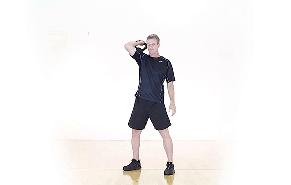 Держите гирю над головой в одной выпрямленной руке. Согните руку в локте и медленно опустите вес за голову. Поднимите гирю обратно в исходное положение. Сделайте короткую паузу и продолжайте делать упражнение. Выполняйте повторения на одной рукой в течение 20 секунд. Меняйте сторону для каждого 20-секундного интервала.
