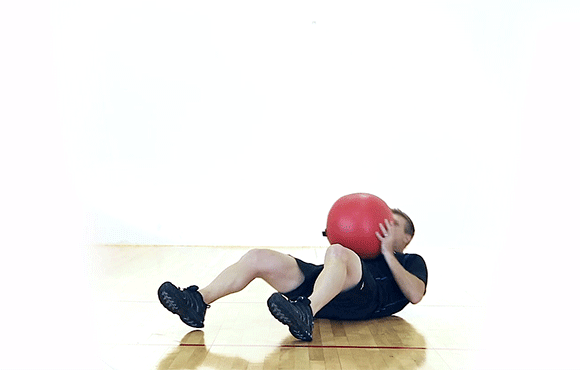 Лягте на спину, слегка согнув ноги в коленях. Держите мяч на уровне груди. Выполните классическое скручивание. В верхней точке поднимите мяч вверх. Медленно вернитесь в исходное положение.