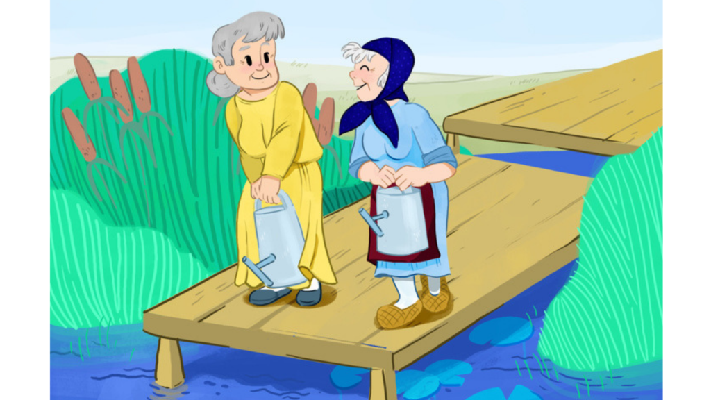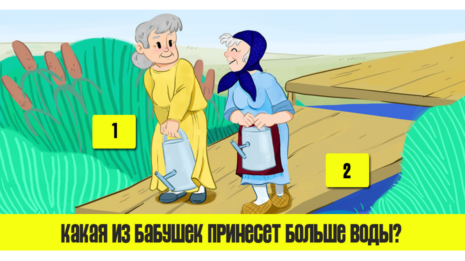 Две старушки пришли к реке, чтобы принести воды для своих садов. Кто из них принесет больше воды?