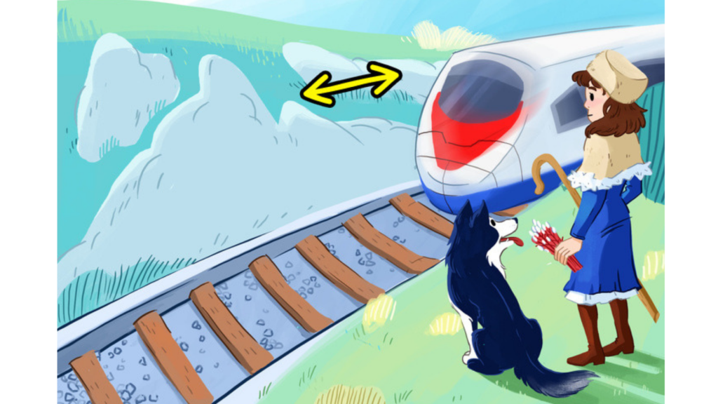 Вы видите железнодорожный участок линии Париж-Франкфурт. Направление железной дороги соответствует направлению стрелки, которая указывает на запад и восток. Посмотрите на картинку и ответьте: куда идет поезд, из Парижа во Франкфурт или наоборот? Какая профессия у девушки?
