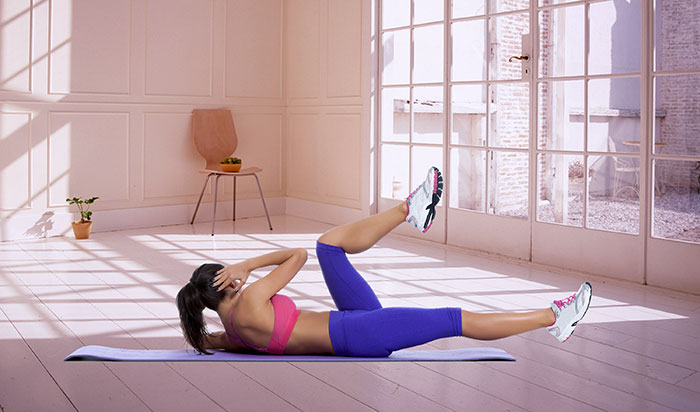 Это упражнение будет полезным для спины и колен. Ложитесь на пол и согните ноги. Ваши голени должны быть параллельными полу. Руки положите за голову. Теперь оторвите верхнюю часть спины от пола и поверните ее влево. Параллельно подтяните правую ногу к груди так, чтобы локоть и колено почти соприкасались. Зафиксируйте позицию на 5 секунд и повторите упражнение для другой стороны. Всего выполните 6 повторений.
