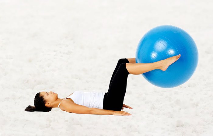 Это упражнение укрепит мышцы бедер. Ложитесь на спину, расположив фитбол между голенями. Зажмите мяч и поднимите ноги, согнув их коленях. Голени должны занять горизонтальное положение. Удерживайте позицию на протяжении 20 секунд. Сделайте 3 повторения.