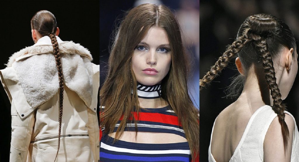 Тут есть сразу пара вариантов. Гладкие длинные косы в стиле Alexander McQueen или несколько жгутов волос. Любые косы хороши, если они нескучные.