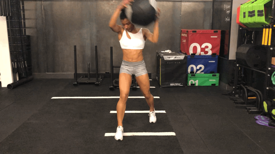 - Встаньте, поднимая медицинский мяч над головой, полностью вытягивая руки прямо над собой.