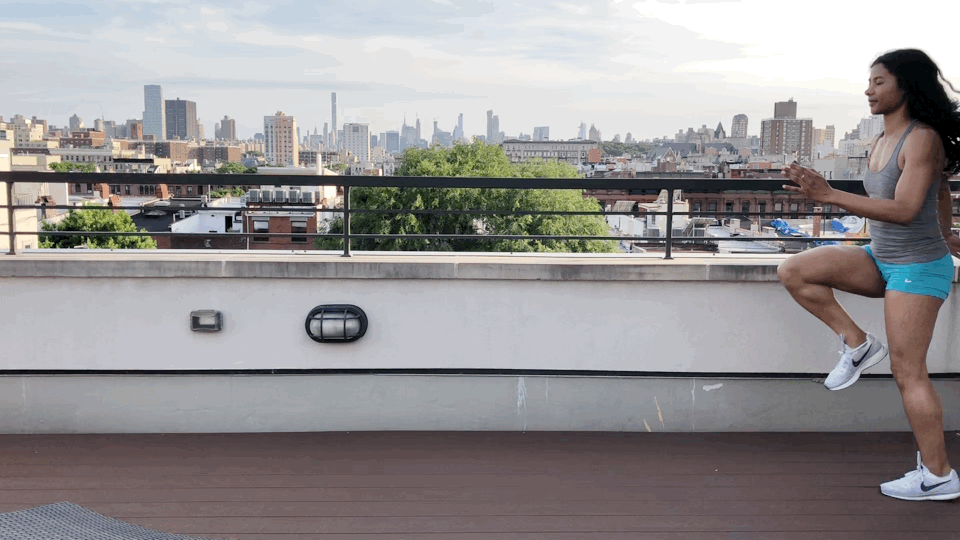 Просто возьмите в руки мяч и бегайте на месте. Старайтесь поднимать высоко колени и не наклонять руки в стороны. Удерживайте темп. Выполняйте как минимум 30 секунд.