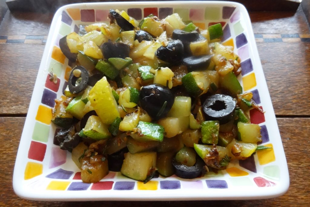 Нагрейте масло в большой сковороде на среднем огне. Добавьте цукини, чеснок и розмарин.Посыпать солью и перцем. Готовьте, пока цукини станут золотистого цвета, в течение 5 минут.н Добавьте оливки. Снимите с огня и подавайте.