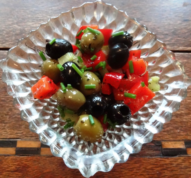 Положите оливки, лимонный сок, оливковое масло и итальянские приправы в миску и смешайте вместе.Оставьте минимум на 30 минут. Это все перемешать в сельдерее и красном перце.Теперь посыпьте луком.