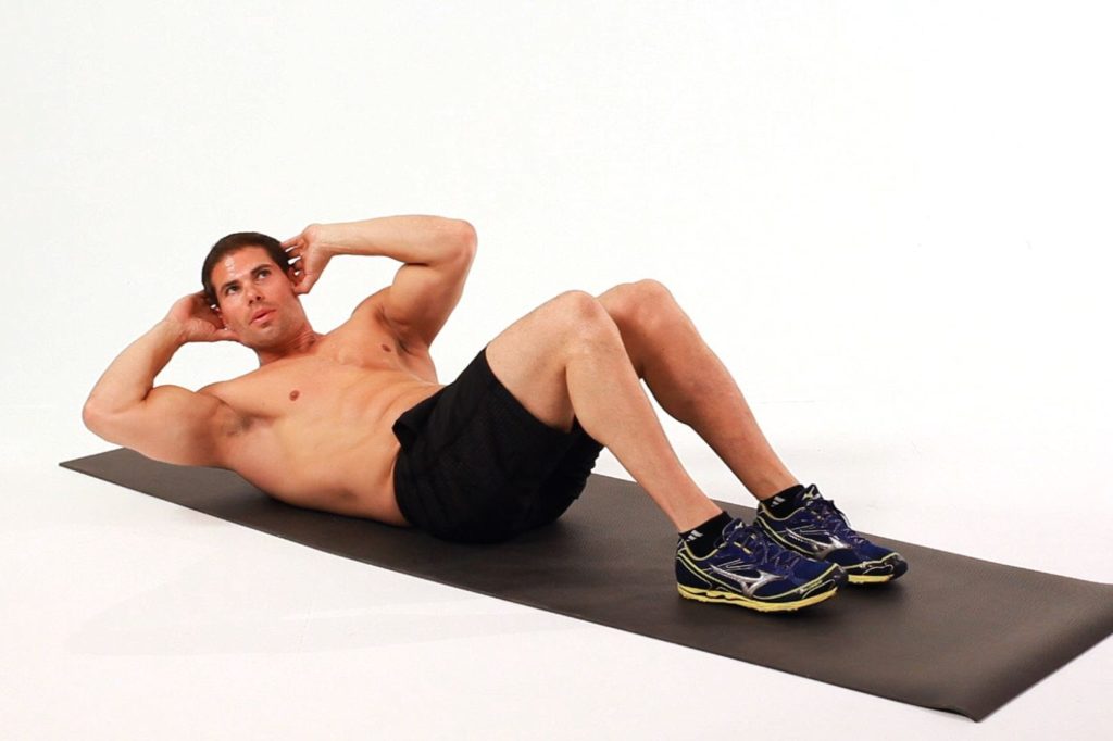 Лягте на коврик или пол. Руки согните в локтях и заведите за голову. Ноги согните в коленях, стопы расположены на полу. Не опускайте голову на пол: она должна находиться на расстоянии в кулак от груди. Начните поднимать корпус вверх. Тянитесь левым локтем к правому колену. Поясница при этом опущена и неподвижна. Движения плавные, не допускайте резкости. Опустившись корпусом вниз, выполните всё то же с правым локтем и левым коленом. Продолжайте делать скручивания и чередовать стороны.