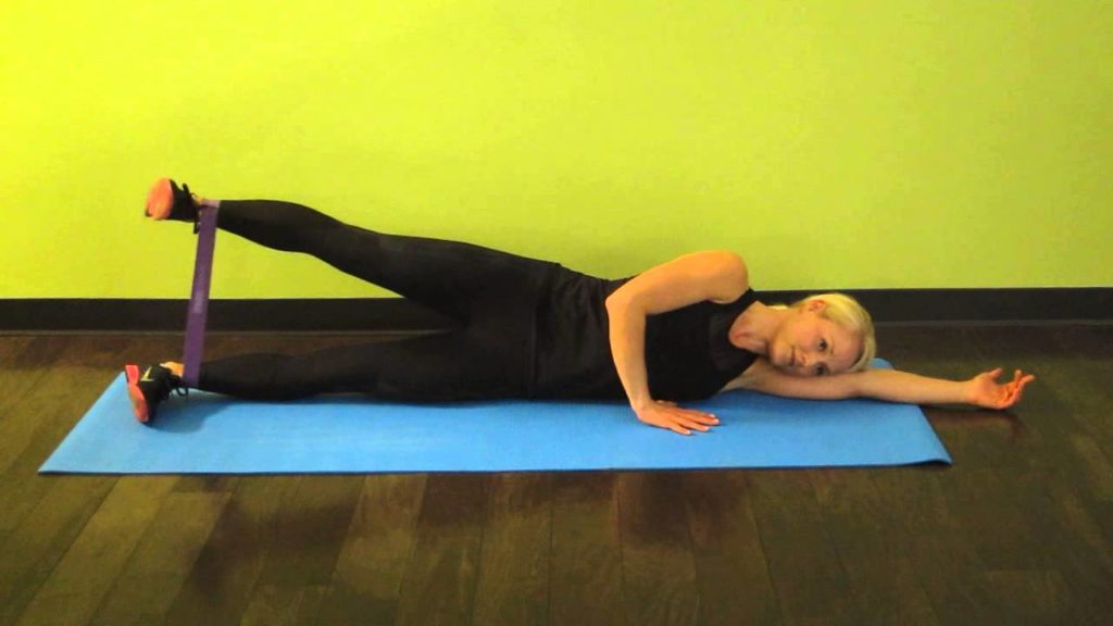 Лягте на левую сторону, надев на лодыжки резиновый эспандер. Левую руку вытяните вперед, чтобы положить на нее голову, а правую поставьте перед собой.