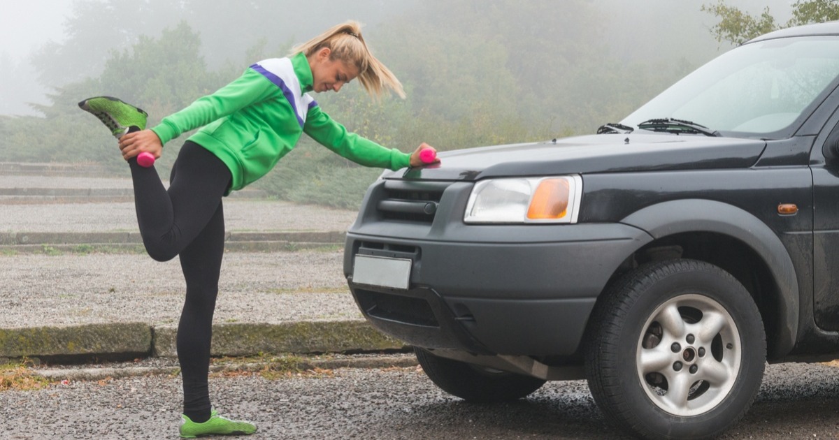 Выйдите из автомобиля и встаньте ровно, расположив ноги на ширине плеч. Теперь наклонитесь вперед, не сгибая колен. Постарайтесь кончиками пальцев достичь земли. Затем положите руки на нижнюю часть спины и прогнитесь назад. Выполните 10-15 повторений