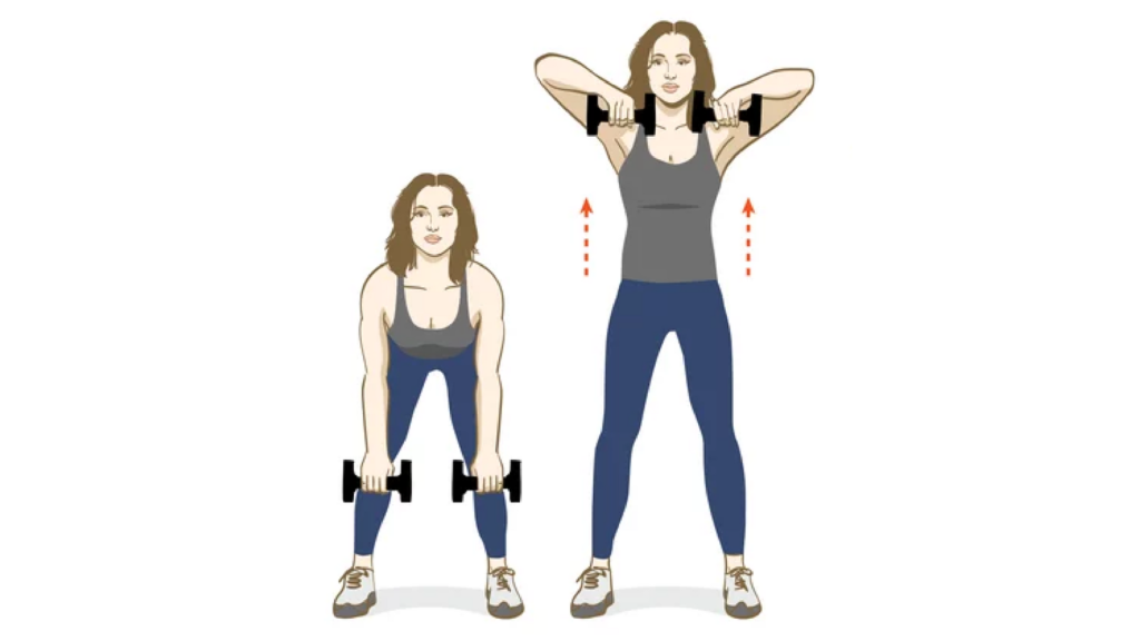 Поставьте ноги на ширине плеч, возьмите гантели в руки и наклонитесь вперед. Начинайте подтягивать гантели вверх и опять возвращайтесь на исходную позицию. Повторите 15 раз.