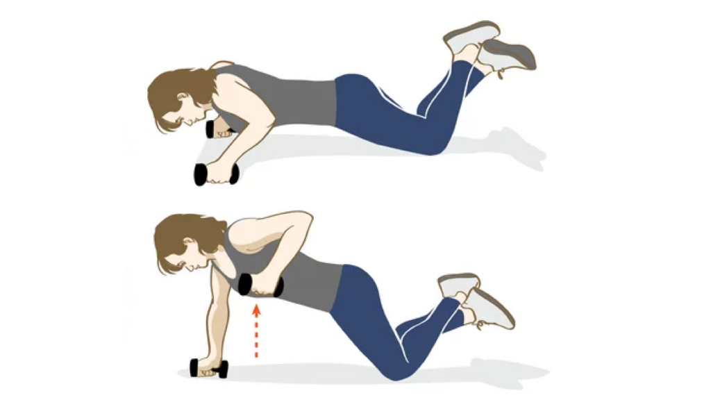 Станьте в позицию планки, опираясь на гантели в каждой руке, коленями упритесь в пол. Начинайте поочередно поднимать руки, сгибая их в локтях. Повторите 10 раз.