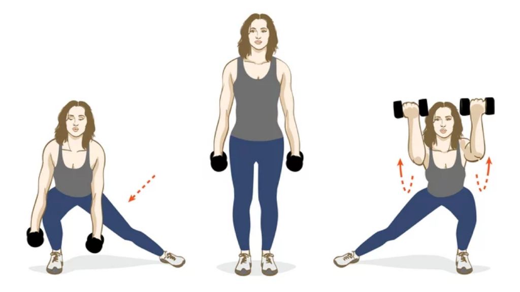 Станьте ровно, возьмите гантели в руки. Сделайте шаг вправо, присев на одну ногу и удерживая вторую ровной. Вернитесь в исходное положение, сделайте шаг влево, но тепер уже подимите руки с гантелями перед собой, как показано на рисунке. Повторите 15 раз.