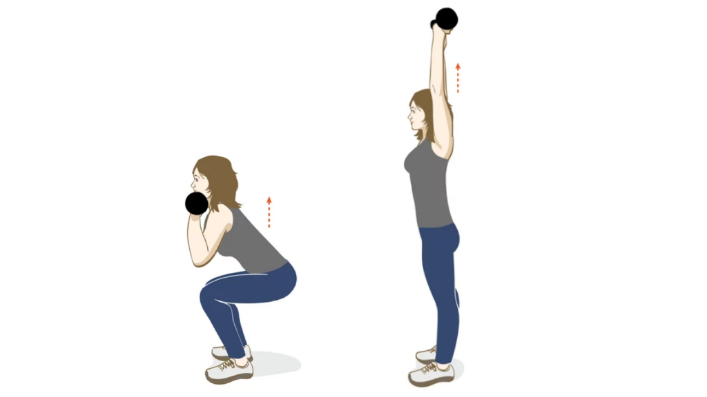 Поставьте ноги на ширине плеч, гантели держите перед собой на уровне плеч, медленно присядьте – это ваша исходная позиция. Выпрямьте ноги, одновременно поднимая руки с гантелями вверх. Повторите 15 раз.