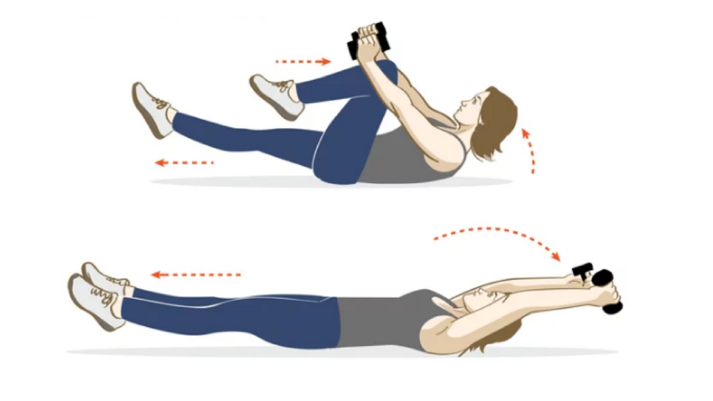 Исходная позиция – лежа на полу с гантелями в руках. Начинайте поочередно сгибать ноги, подтягивая их соответственно левую к правой стороне и наоборот. Одновременно тянитесь прямыми руками к ногам.