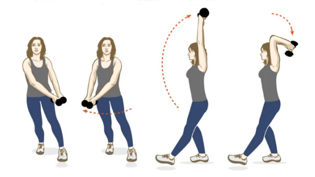 Исходная позиция: левая нога немного впереди, руки с гантелями держите вместе с левой стороны. Начинайте качать руками вправо и возвращайте их назад. Продолжайте удерживать левую ногу впереди себя, гантели теперь поднимите вверх и согните локти, опустив гантели за голову. Повторите по 10 раз для каждой стороны.