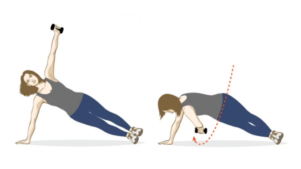 Исходная позиция – боковая планка с поднятой вверх правой рукой, в руке гантель. Начинайте опускать руку с гантелью, стараясь как можно глубже протянуть ее в проем между правой рукой и телом. Вернитесь в исходную позицию. Повторите 10 раз для каждой стороны.