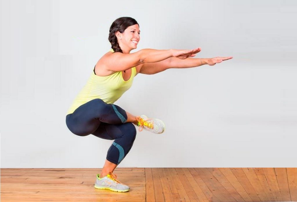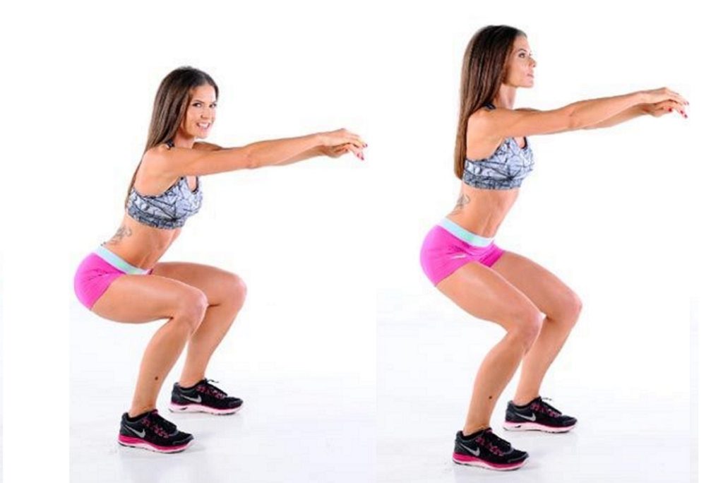 Встаньте прямо, ноги разместите на ширине плеч, стопы параллельно, руки вытяните вперед ладонями вниз. Начните сгибать ноги в коленях до тех пор, пока ваши бедра не будут параллельны полу. Напрягите ягодичные мышцы и пресс во время упражнения.