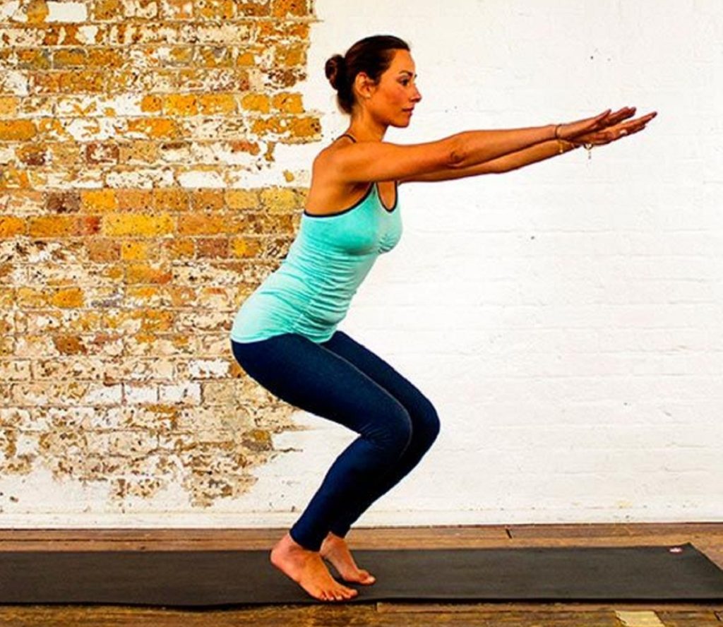 Встаньте прямо, ноги вместе. Теперь поднимитесь на носочки и вытяните руки перед собой. Опускайтесь бедрами на воображаемый стул, а руками балансируйте, поднимая их вверх. Главная задача – удержаться на носках и не упасть. Плавно встаньте.