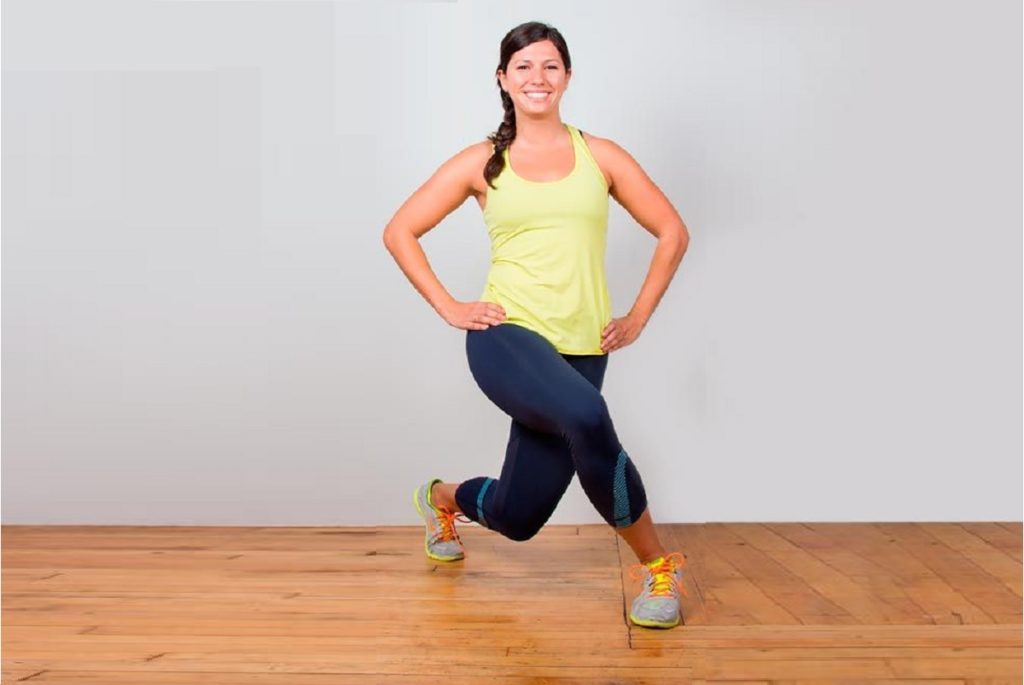 Встаньте прямо и разместите ноги на ширине плеч, руки поставьте на бедра. Затем отведите правую ногу назад и влево. Присядьте на обеих ногах. Оба колена должны быть согнуты под прямым углом. Вес держите на передней ноге. Вернитесь в исходное положение.