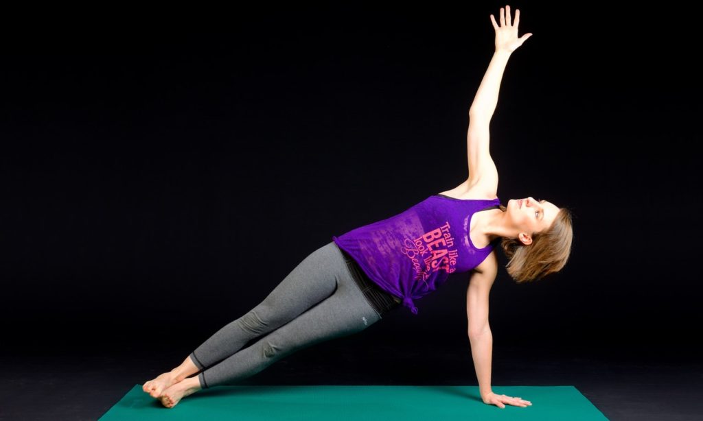 Ложитесь на пол и обопритесь на ладонь одной руки. Нижнюю ногу лучше согнуть в колене для дополнительного упора. Ваше тело должно образовать идеально прямую линию от головы до пят. Находясь в этом положении, втяните живот и удерживайте на протяжении 30 секунд. Постепенно увеличивайте длительность упражнения до 2 минут.